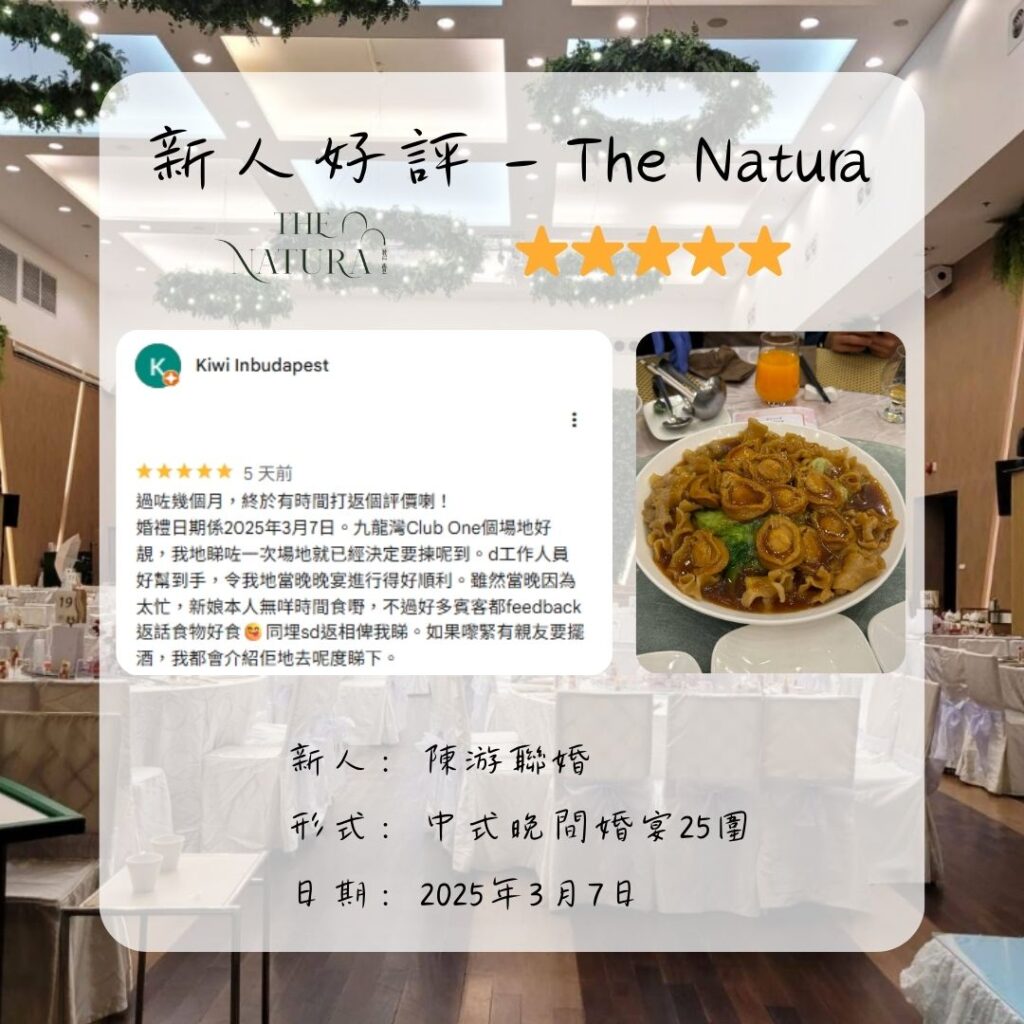 婚禮日期係2025年3月7日。九龍灣Club One個場地好靚,我地睇咗一次場地就已經決定要揀呢到。d工作人員好幫到手,令我地當晚晚宴進行得好順利。雖然當晚因為太忙,新娘本人無咩時間食嘢,不過好多賓客都feedback返話食物好食😋同埋sd返相俾我睇。如果嚟緊有親友要擺酒,我都會介紹佢地去呢度睇下。