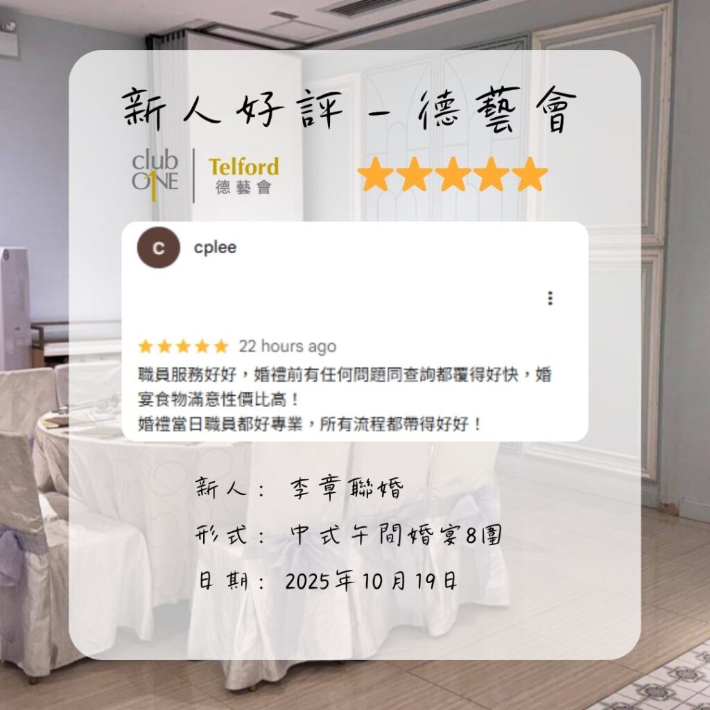 ClubONE德藝會是輕婚禮熱門場地,婚宴場地設有夢幻baby blue宴會廳,分適合舉辦各類型中西式婚宴酒席、雞尾酒會、午間證婚及晚間婚宴等。
