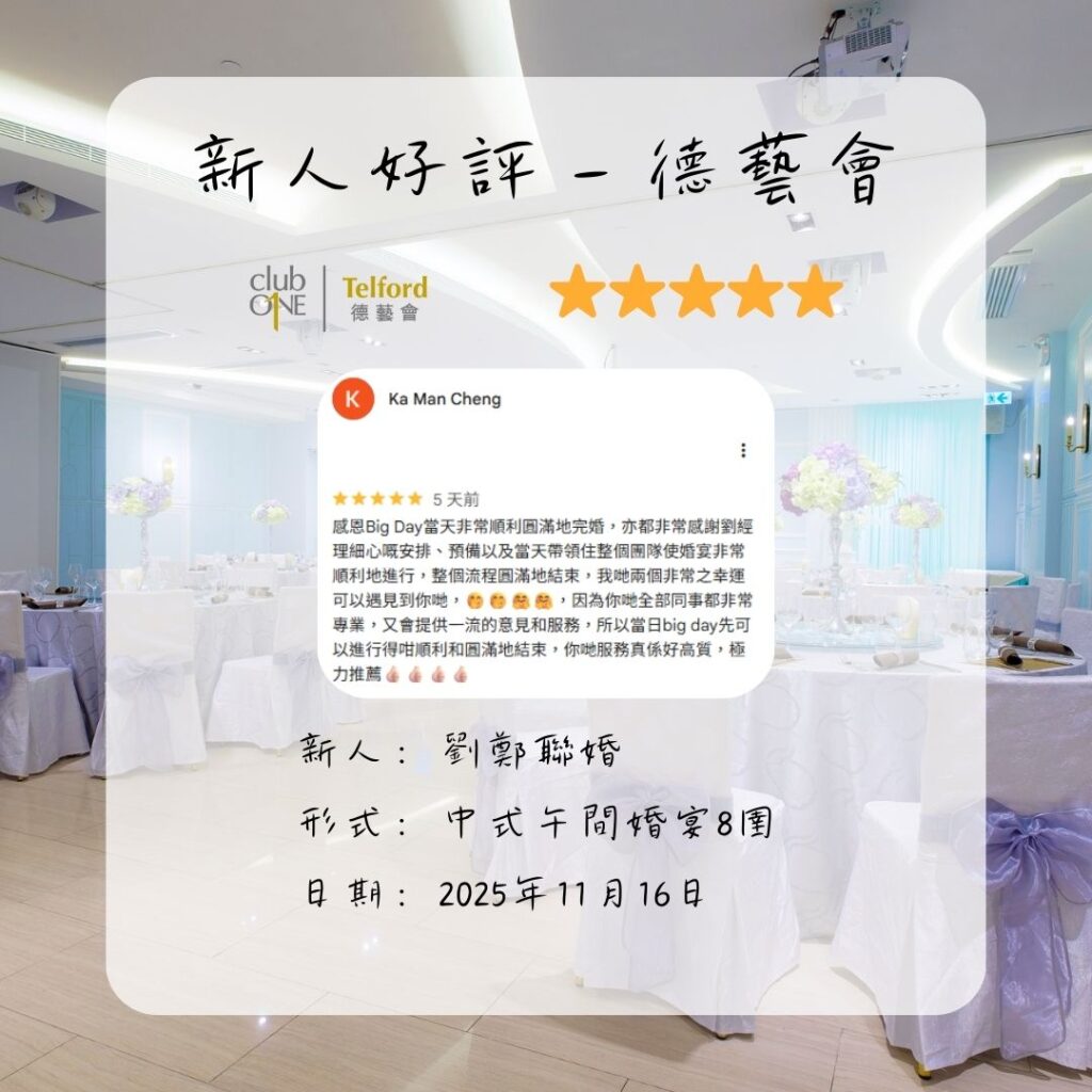 感恩Big Day當天非常順利圓滿地完婚,亦都非常感謝劉經理細心嘅安排、預備以及當天帶領住整個團隊使婚宴非常順利地進行,整個流程圓滿地結束,我哋兩個非常之幸運可以遇見到你哋,🤭🤭🤗🤗,因為你哋全部同事都非常專業,又會提供一流的意見和服務,所以當日big day先可以進行得咁順利和圓滿地結束,你哋服務真係好高質,極力推薦👍🏻👍🏻👍🏻👍🏻