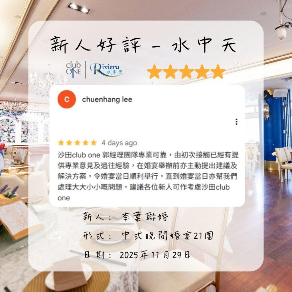 沙田club one 郭經理團隊專業可靠,由初次接觸已經有提供專業意見及過往經驗,在婚宴舉辦前亦主動提出建議及解決方案,令婚宴當日順利舉行,直到婚宴當日亦幫我們處理大大小小嘅問題,建議各位新人可作考慮沙田club one