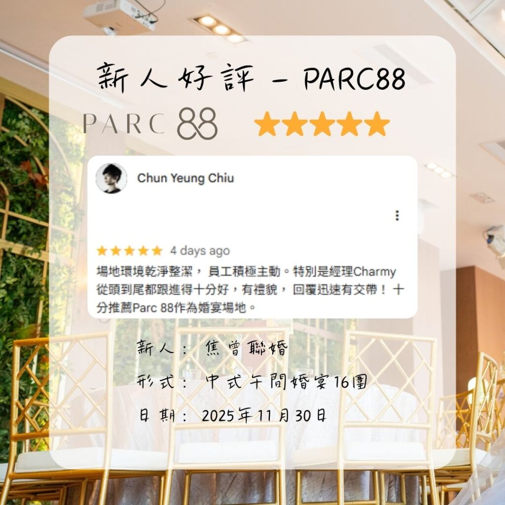 場地環境乾淨整潔, 員工積極主動。特別是經理Charmy 從頭到尾都跟進得十分好,有禮貌, 回覆迅速有交帶! 十分推薦Parc 88作為婚宴場地。