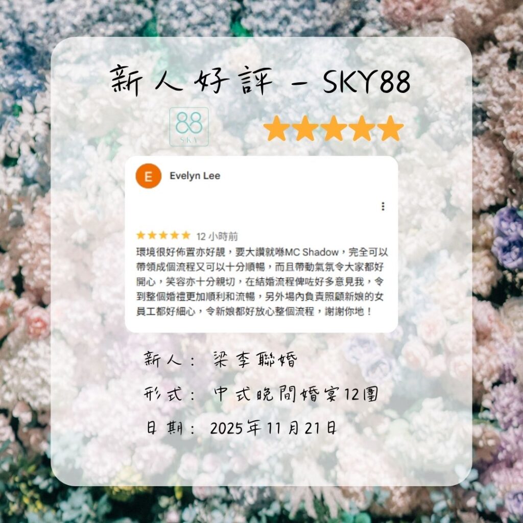 環境很好佈置亦好靚,要大讚就喺MC Shadow,完全可以帶領成個流程又可以十分順暢,而且帶動氣氛令大家都好開心,笑容亦十分親切,在結婚流程俾咗好多意見我,令到整個婚禮更加順利和流暢,另外場內負責照顧新娘的女員工都好細心,令新娘都好放心整個流程,謝謝你地!