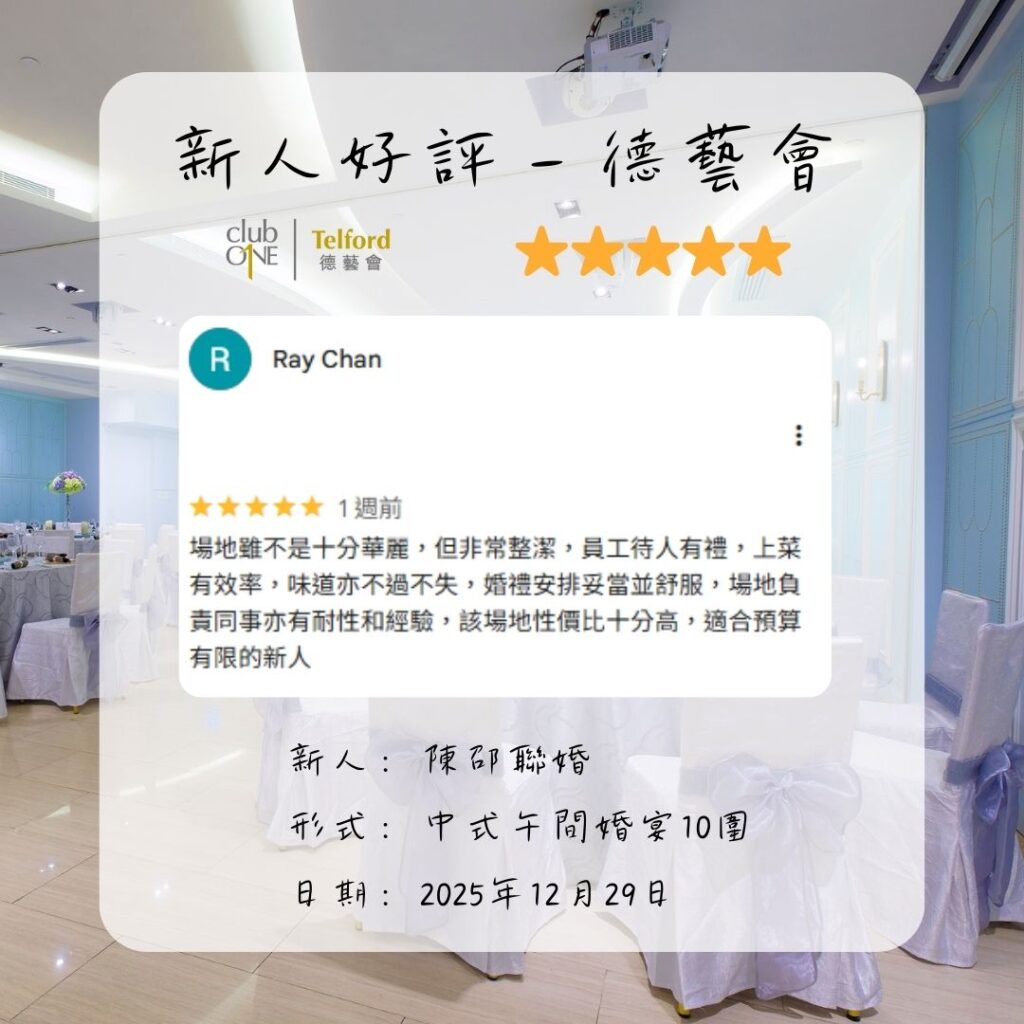 德藝會婚禮好評︰「婚禮安排妥當並舒服,場地負責同事亦有耐性和經驗,該場地性價比十分高」— 新人評價陳邵聯婚