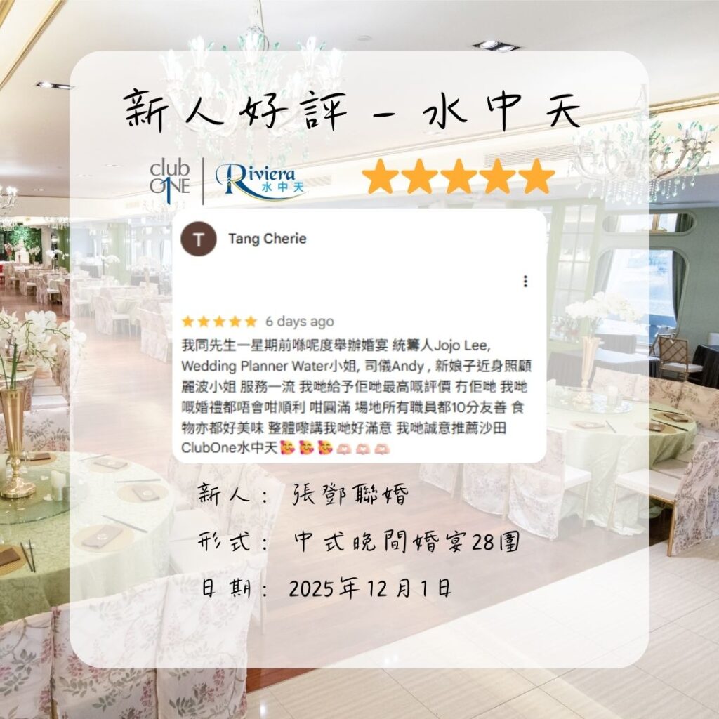 我同先生一星期前喺呢度舉辦婚宴 統籌人Jojo Lee, Wedding Planner Water小姐, 司儀Andy , 新娘子近身照顧 麗波小姐 服務一流 我哋給予佢哋最高嘅評價 冇佢哋 我哋嘅婚禮都唔會咁順利 咁圓滿 場地所有職員都10分友善 食物亦都好美味 整體嚟講我哋好滿意 我哋誠意推薦沙田ClubOne水中天🥰🥰🥰🫶🏻🫶🏻🫶🏻
