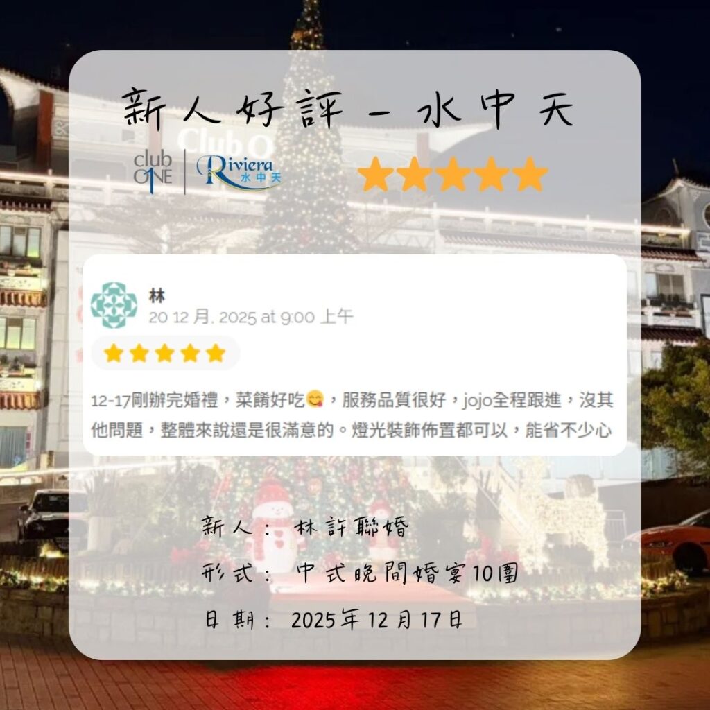 ClubONE水中天是熱門戶外草地輕婚禮場地,盡覧海天一色的180度城門景緻,設有兩個戶外證婚花園區及三個宴會廳,適合舉辦50人至200人的小型婚禮、中西式婚宴酒席、雞尾酒會、午間證婚及晚間婚宴等。