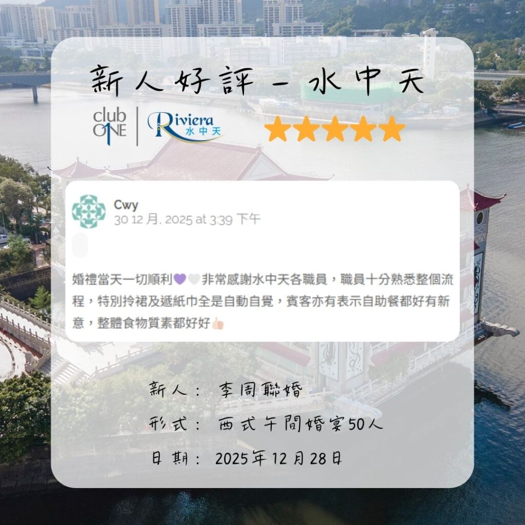 婚禮當天一切順利非常感謝水中天各職員,職員十分熟悉整個流程,特別拎裙及遞紙巾全是自動自覺,賓客亦有表示自助餐都好有新意,整體食物質素都好好