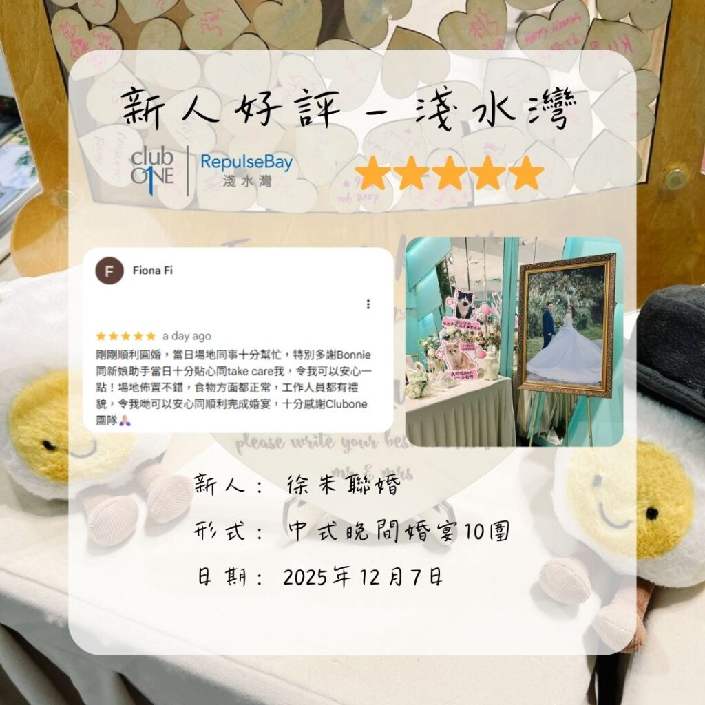 剛剛順利圓婚,當日場地同事十分幫忙,特別多謝Bonnie同新娘助手當日十分貼心同take care我,令我可以安心一點!場地佈置不錯,食物方面都正常,工作人員都有禮貌,令我哋可以安心同順利完成婚宴,十分感謝Clubone團隊🙏🏻