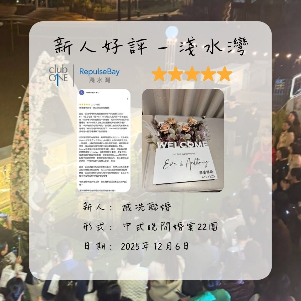 ClubONE淺水灣是熱門戶外沙灘婚禮場地,場地設有四個宴會廳,三個海景戶外婚禮證婚區,適合舉辦50人至200人的小型婚禮、中西式婚宴酒席、雞尾酒會、午間證婚及晚間婚宴等。