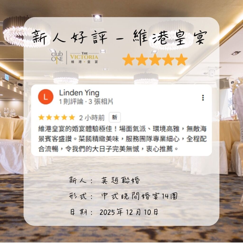 維港皇宴的婚宴體驗極佳!場面氣派、環境高雅,無敵海景賓客盛讚。菜餚精緻美味,服務團隊專業細心,全程配合流暢,令我們的大日子完美無憾,衷心推薦。