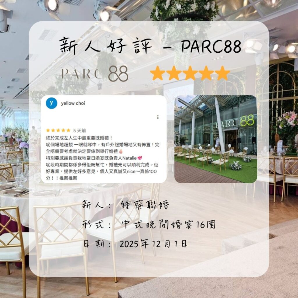 ClubONE PARC88是熱門戶外輕婚禮場地,宴會廳以田園系玻璃屋作為設計靈感,採光度十足,猶如外國森林婚禮。婚宴場地可彈性配合新人需要,適合舉辦各類型中西式婚宴酒席、雞尾酒會、午間證婚及晚間婚宴等。PARC88設有戶外草地證婚花園,加上寫意湖景,是香港少有的湖畔婚禮證婚,推薦喜歡簡約清新婚禮的新人。