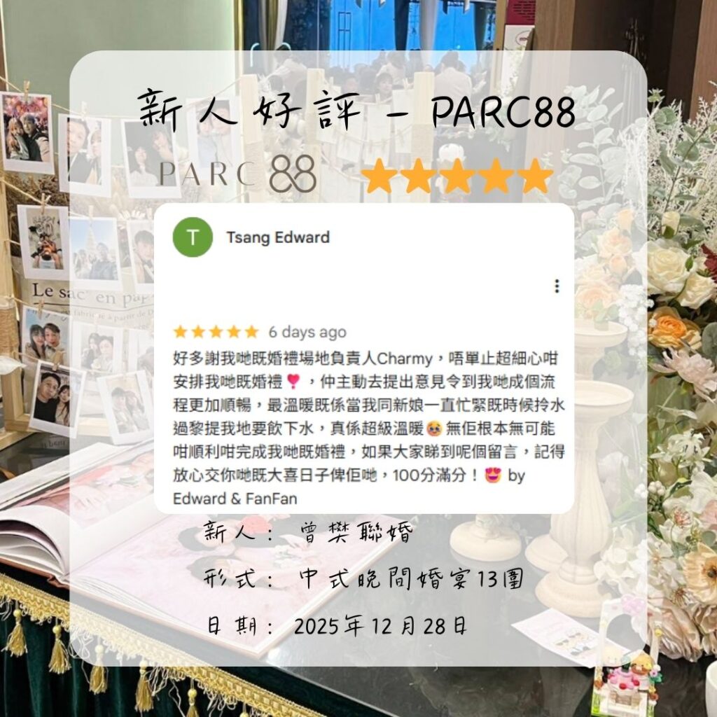 好多謝我哋既婚禮場地負責人Charmy,唔單止超細心咁安排我哋既婚禮❣️,仲主動去提出意見令到我哋成個流程更加順暢,最溫暖既係當我同新娘一直忙緊既時候拎水過黎提我地要飲下水,真係超級溫暖🥹無佢根本無可能咁順利咁完成我哋既婚禮,如果大家睇到呢個留言,記得放心交你哋既大喜日子俾佢哋,100分滿分!😍 by Edward & FanFan