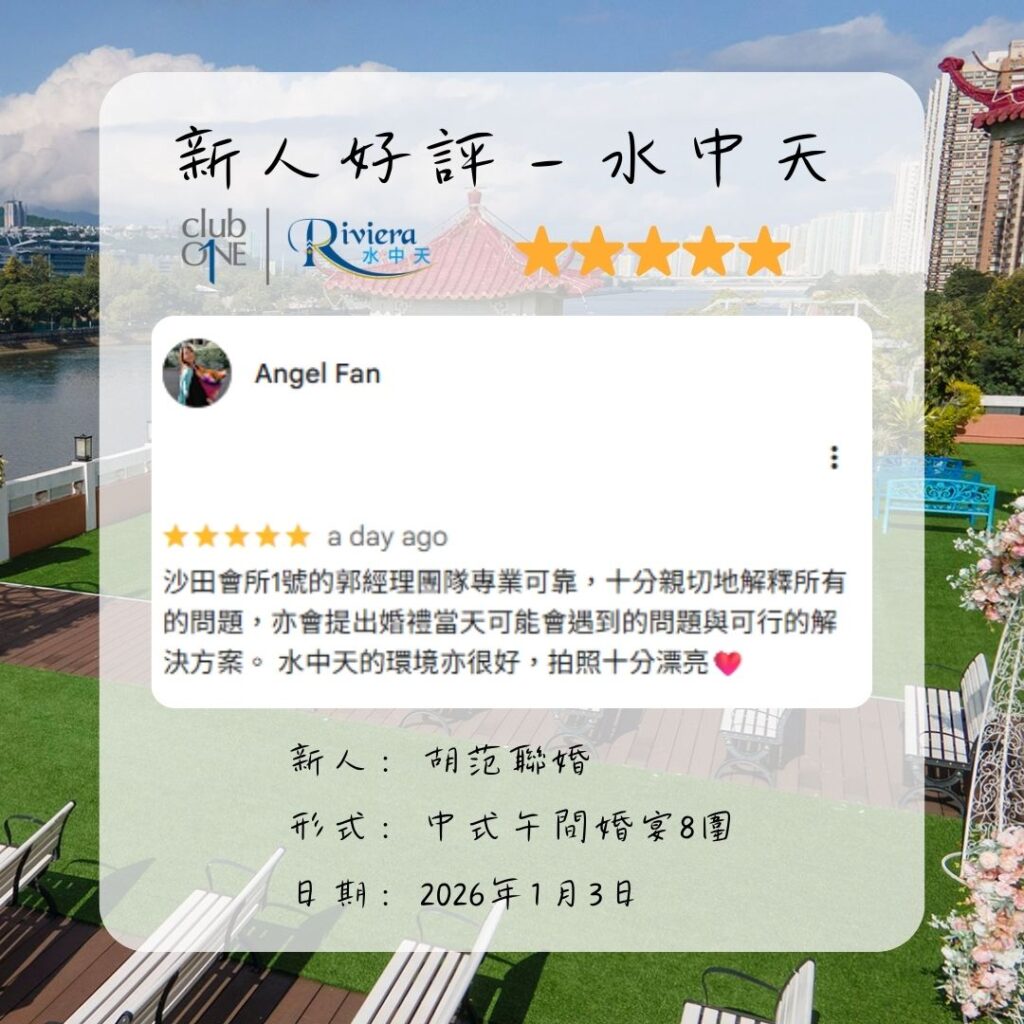 沙田會所1號的郭經理團隊專業可靠,十分親切地解釋所有的問題,亦會提出婚禮當天可能會遇到的問題與可行的解決方案。 水中天的環境亦很好,拍照十分漂亮❤️