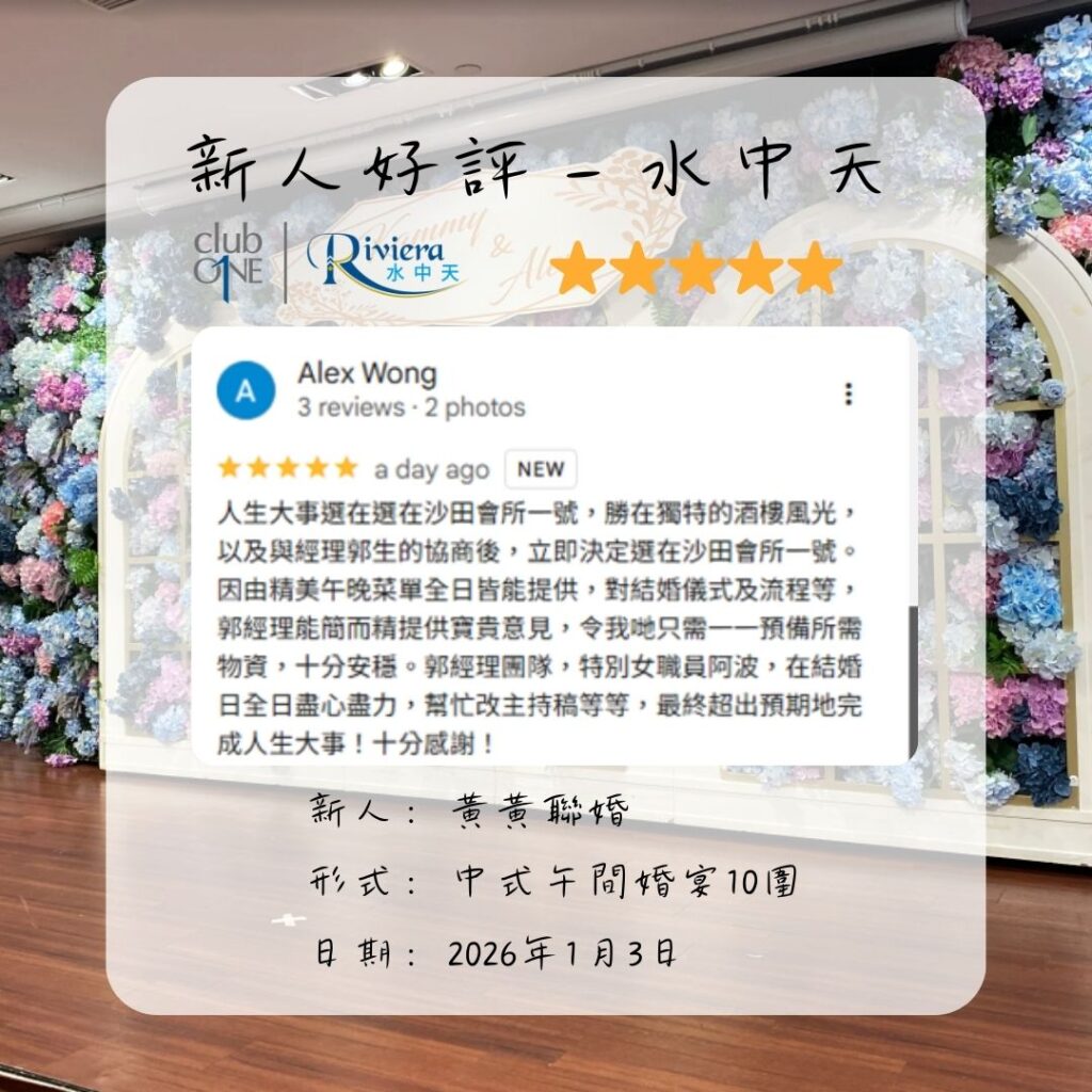 人生大事選在選在沙田會所一號,勝在獨特的酒樓風光, 以及與經理郭生的協商後,立即決定還在沙田會所一號。 因由精美午晚菜單全日皆能提供,對結婚儀式及流程等, 郭經理能簡而精提供寶貴意見,令我哋只需一一預備所需 物資,十分安穩。郭經理團隊,特別女職員阿波,在結婚 日全日盡心盡力,幫忙改主持稿等等,最終超出預期地完 成人生大事!十分感謝!