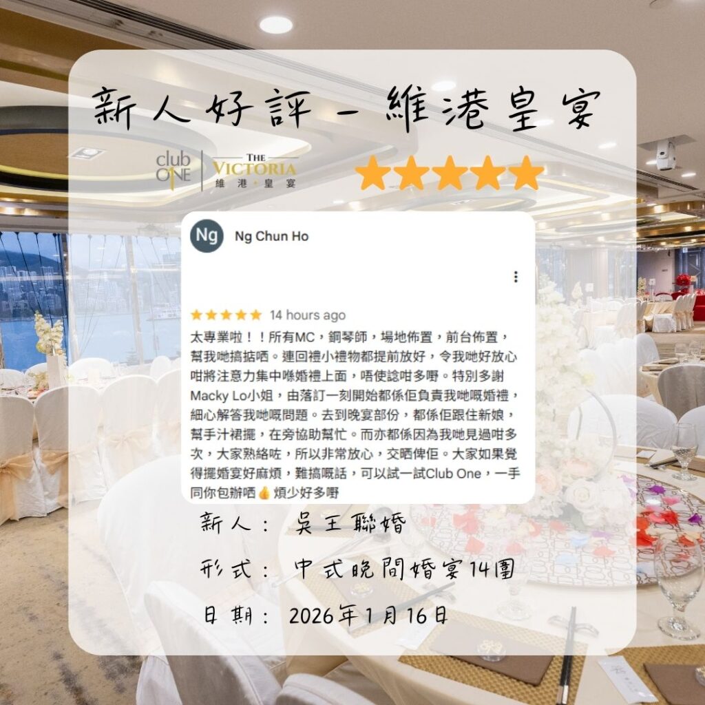 太專業啦!!所有MC,鋼琴師,場地佈置,前台佈置,幫我哋搞掂哂。連回禮小禮物都提前放好,令我哋好放心咁將注意力集中喺婚禮上面,唔使諗咁多嘢。特別多謝Macky Lo小姐,由落訂一刻開始都係佢負責我哋嘅婚禮,細心解答我哋嘅問題。去到晚宴部份,都係佢跟住新娘,幫手汁裙擺,在旁協助幫忙。而亦都係因為我哋見過咁多次,大家熟絡咗,所以非常放心,交晒俾佢。大家如果覺得擺婚宴好麻煩,難搞嘅話,可以試一試Club One,一手同你包辦哂👍煩少好多嘢
