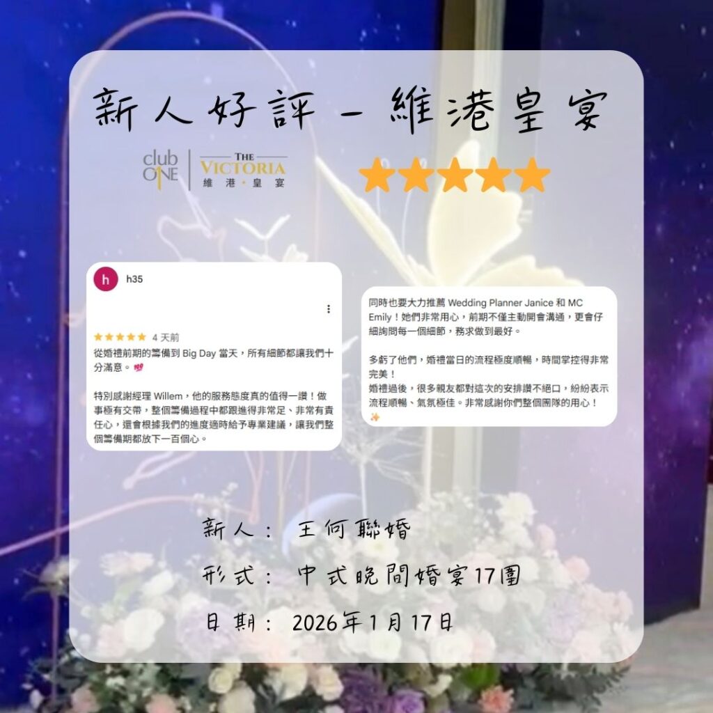 維港皇宴婚禮好評︰「從婚禮前期的籌備到 Big Day 當天,所有細節都讓我們十分滿意。💯」— 新人評價王何聯婚