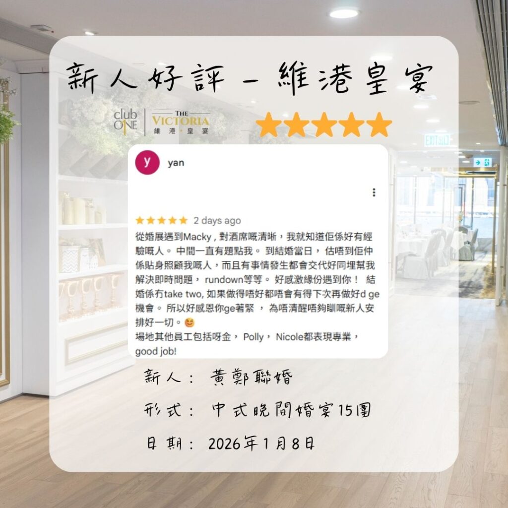 維港皇宴婚禮好評︰「有事情發生都會交代好同埋幫我解決即時問題, rundown等等」— 新人評價黃鄭聯婚