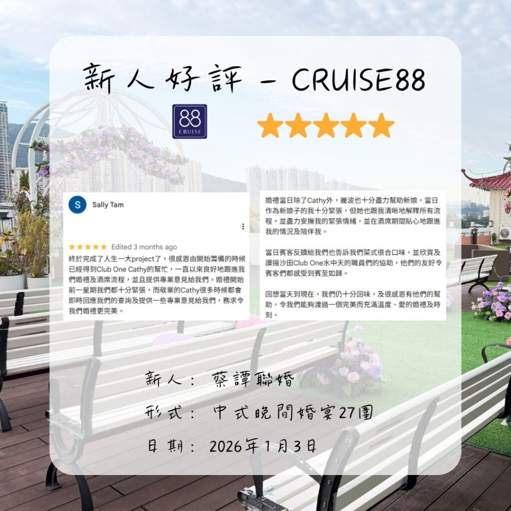 ClubONE CRUISE88是熱門戶外草地輕婚禮場地,盡覧海天一色的180度城門景緻,設有兩個戶外證婚花園區及三個宴會廳,適合舉辦50人至200人的小型婚禮、中西式婚宴酒席、雞尾酒會、午間證婚及晚間婚宴等。