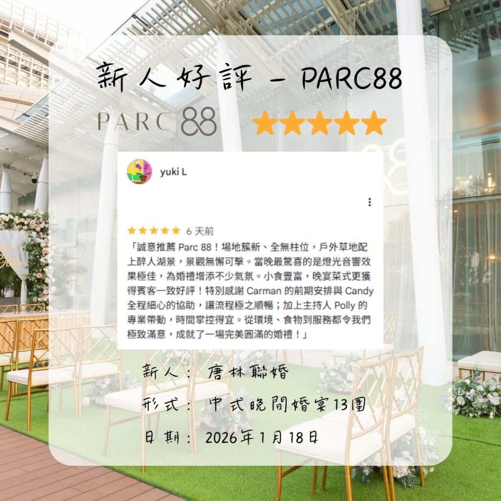 「誠意推薦 Parc 88!場地簇新、全無柱位,戶外草地配上醉人湖景,景觀無懈可擊。當晚最驚喜的是燈光音響效果極佳,為婚禮增添不少氣氛。小食豐富,晚宴菜式更獲得賓客一致好評!特別感謝 Carman 的前期安排與 Candy 全程細心的協助,讓流程極之順暢;加上主持人 Polly 的專業帶動,時間掌控得宜。從環境、食物到服務都令我們極致滿意,成就了一場完美圓滿的婚禮!」