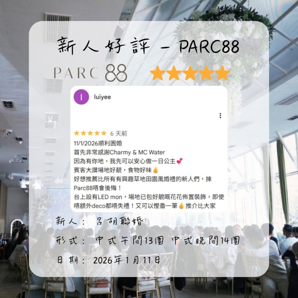 PARC88婚禮好評︰「好想推薦比所有有興趣草地田園風婚禮的新人們,揀Parc88唔會後悔!」— 新人評價呂胡聯婚