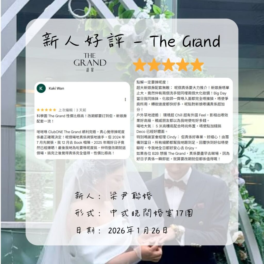 The Grand婚禮好評︰「為咗要喺呢度搞,仲特登改期就返個場,搞完之後覺得真係完全值得,性價比極高!」— 新人評價梁尹聯婚