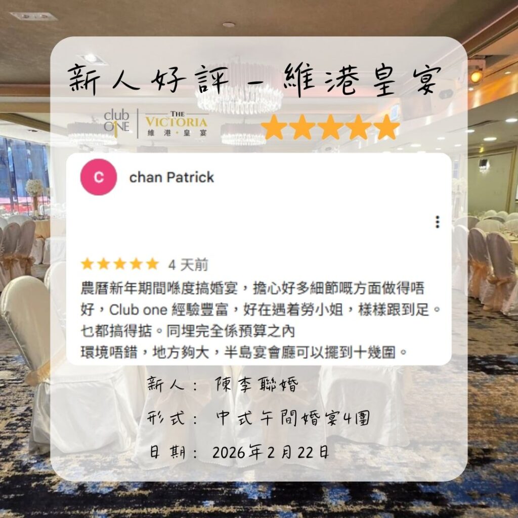 農曆新年期間喺度搞婚宴,擔心好多細節嘅方面做得唔好,Club one 經驗豐富,好在遇着勞小姐,樣樣跟到足。乜都搞得掂。同埋完全係預算之內 環境唔錯,地方夠大,半島宴會廳可以擺到十幾圍。
