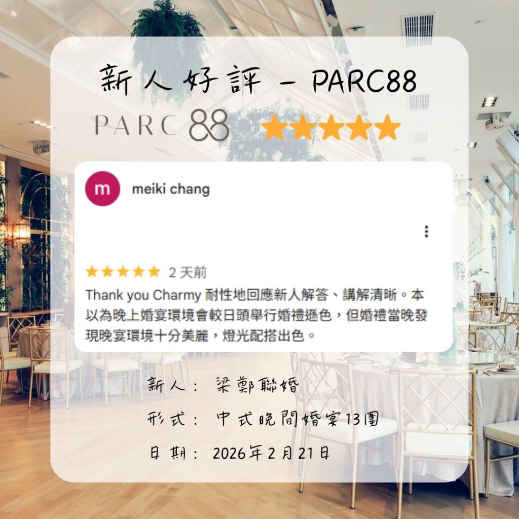 PARC88婚禮好評︰「晚宴環境十分美麗,燈光配搭出色」— 新人評價梁鄭聯婚