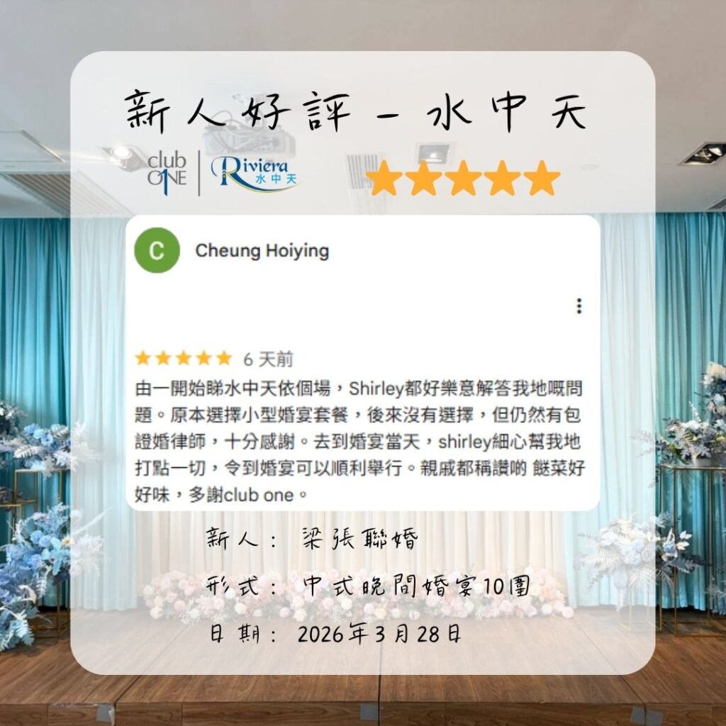 由一開始睇水中天依個場,Shirley都好樂意解答我地嘅問題。原本選擇小型婚宴套餐,後來沒有選擇,但仍然有包證婚律師,十分感謝。去到婚宴當天,shirley細心幫我地打點一切,令到婚宴可以順利舉行。親戚都稱讚啲 餸菜好好味,多謝club one。
