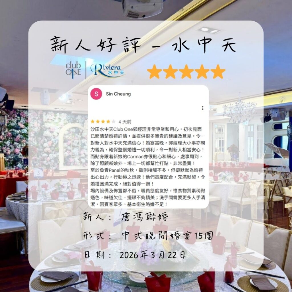 沙田水中天Club One郭經理非常專業和用心,初次見面已問清楚婚禮詳情,並提供很多寶貴的建議及意見,令一對新人對水中天充滿信心!婚宴當晚,郭經理大小事亦親力親為,確保整個婚禮一切順利,令一對新人相當安心! 而貼身跟着新娘的Carman亦很貼心和細心,處事周到,除了照顧新娘外,場上一切都幫忙打點,非常盡責! 至於負責Panel的秋秋,雖則接觸不多,但卻默默為婚禮出心出力,行動極之迅速!他們高度配合,充滿默契,令婚禮圓滿完成,絕對值得一讚! 場內設備及佈置都不俗,職員態度友好,惟食物質素稍微遜色,味道欠佳,擺碟不夠精美;洗手間需要更多人手清潔,因賓客眾多,基本衛生略嫌不足!