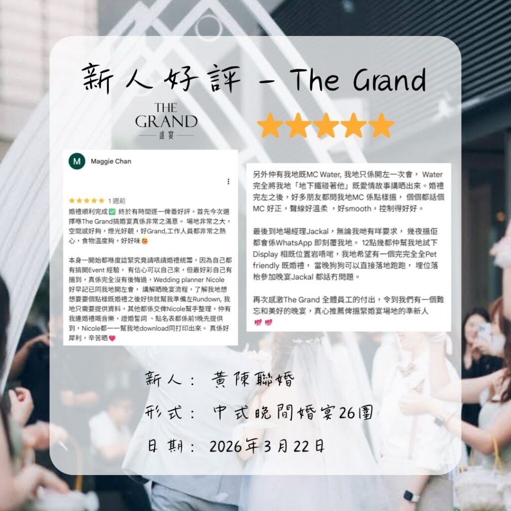 再次感激The Grand 全體員工的付出,令到我們有一個難忘和美好的晚宴,真心推薦俾搵緊婚宴場地的準新人💯💯